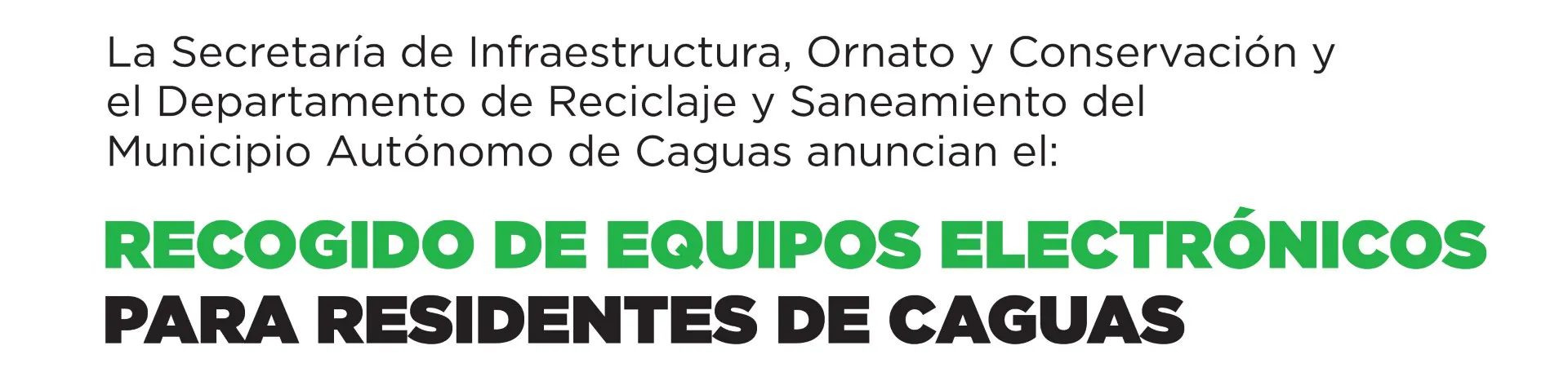 ¡La Secretaría de Infraestructura, Ornato y Conservación y el Departamento de Reciclaje y Saneamiento del Municipio Autónomo de Caguas anuncian el Recogido de Equipos Electrónicos para Residentes de Caguas este sábado, 18 de abril de 2026 de 8:00 a.m. a 1:00 p.m. en el Monumento a Luis Muñoz Marín Carretera PR-1, sector Bairoa, Caguas!